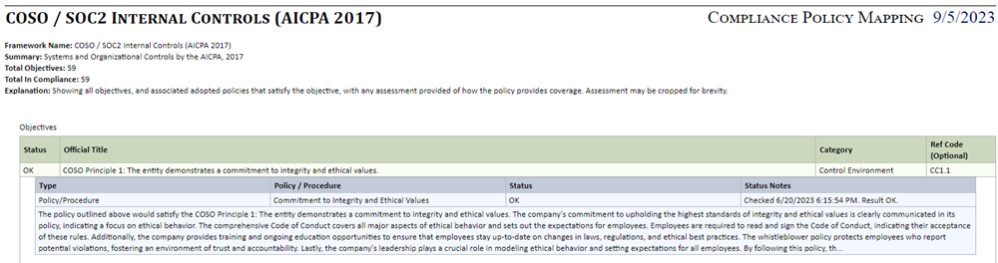 The Compliance Policy Mapping report will show all objectives' evidence that are linked to policies. It will also include any explanation/notes provided for each evidence, along with the current performance status of the linked policy.