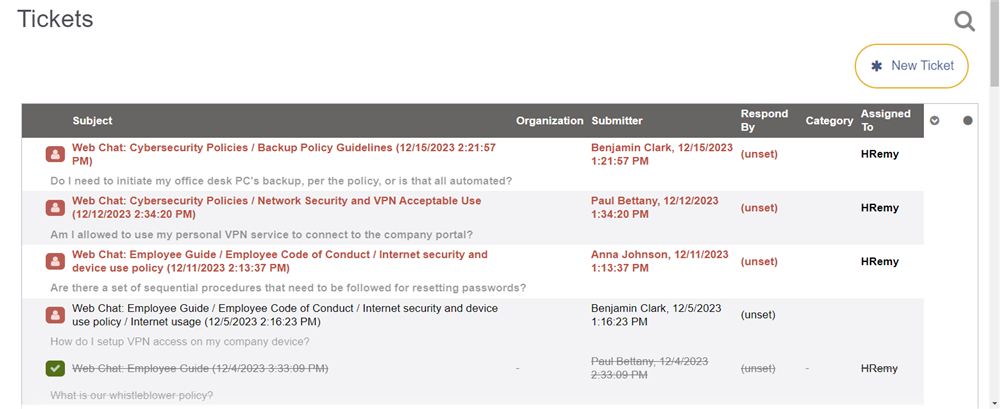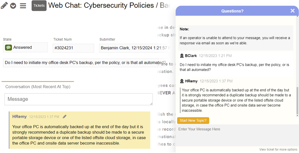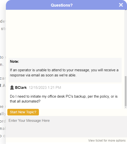 The webchat is automatically added to all policies and procedures articles on your site. This provides an easy way for users to submit support tickets when reading through your organization's documentation.