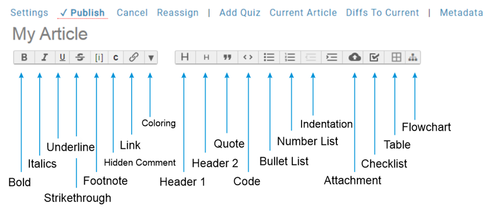 Getting back to the editor itself, the following formatting options appear when inserting or updating an article.