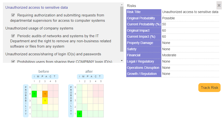 Because in most cases the policies you are creating for your clients are generally implemented to reduce risks within their organization, we make it easy to highlight and emphasize those risks and the mitigations that the policy employs. To effectively convey the components of a policy or procedure related to specific company risks, or the segments aimed at reducing those risks, we provide a handy tool called the Inline Risk Visualizer.